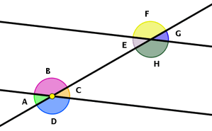 La posición relativa de los ángulos con respecto a las rectas hace que esos ángulos reciban unos nombres específicos. Así, llamamos ángulos correspondientes a los que están situados al mismo lado de las paralelas y al mismo lado de la transversal. Son correspondientes, por ejemplo, el A y el E, o también el B y el F.