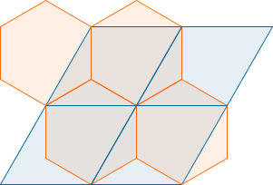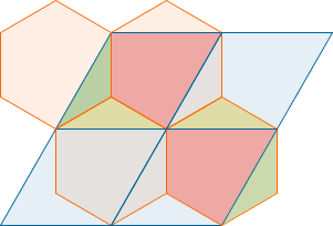 Hemos sustituido el azulejo diamante por el azulejo hexágono regular porque generan azulejados equivalentes (ver la siguiente figura, con las dos tramas superpuestas) y el segundo, al ser más familiar, nos resulta más fácil de percibir.