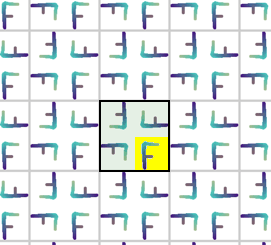 La forma del azulejo es importante porque según tenga o no cierto tipo de simetría podremos disponer o no copias simétricas del motivo decorativo en su interior. Por ejemplo, la simetría rotacional del cuadrado permite dividirlo en cuatro partes iguales, elegir una (llamada celda primitiva, resaltada en amarillo en el azulejo enmarcado de la siguiente imagen), dibujar el motivo en ella y rotarlo 90º sucesivas veces. Esto no se podría hacer si el azulejo no fuera cuadrado.