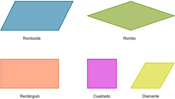 Observa que la mitad de cada paralelogramo corresponde a diferentes tipos de triángulos: escaleno, isósceles, rectángulo, rectángulo isósceles y equilátero.